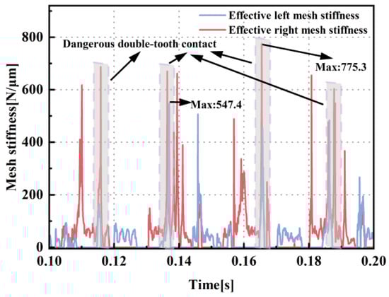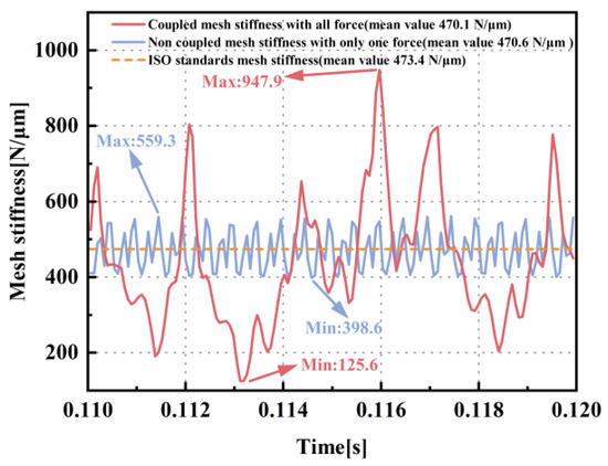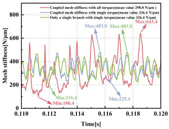 - Under the coupled state, the maximum mesh stiffness demonstrates an increase of 69.5%, and the minimum mesh stiffness reaches only 31.5% of its non-coupled state value. The phenomena of marked oscillations in mesh stiffness come from the nonlinear dynamic coupling effects resulting from the propagation of external loads. The changes in the mesh stiffness characteristic can potentially lead to unforeseen failure issues under gear operating conditions.