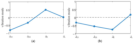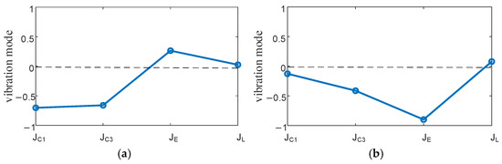 EVT1 mode. (a) First-order vibrational mode (f1 = 17.55 Hz), (b) second-order vibrational mode (f2 = 37.43 Hz).