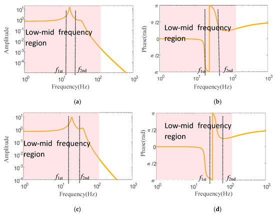 Comparison of frequency characteristics between EVT1 and EVT2 modes, (a) amplitude-frequency characteristic of EVT2 mode, (b) phase-frequency characteristic of EVT2 mode, (c) amplitude-frequency characteristic of EVT2 mode, (d) phase-frequency characteristic of EVT2 mode.