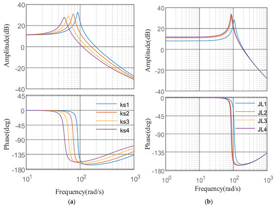 Using the parameter values for ks and JL specified in Table 2, the transfer function G1(s) was computed for various system configurations. The corresponding frequency response characteristics are presented in Figure 9.