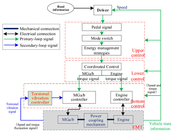 The control process of the EMT system with torsional vibration suppression operates as follows: Initially, the pedal signal interpretation module converts accelerator inputs into total power demand based on real-time vehicle states. Subsequently, the mode transition module selects the optimal EVT mode according to vehicle speed and pedal position. The energy management system (EMS) then allocates the total power demand between the engine and battery, while transmitting both the power distribution scheme and system state references to the coordinated control module in the lower-level controller. This module dynamically optimizes the torque targets for Motor A, Motor B, and the engine by integrating operational state feedback, ensuring rapid and stable achievement of the EMS objectives. Finally, the adjusted reference torque signals are distributed via CAN bus to the motor and engine controllers. Simultaneously, the torsional vibration control module executes active damping algorithms using real-time vibration data to generate compensatory torque signals. These coordinated actions enable seamless actuator control for smooth vehicle propulsion while effectively suppressing driveline oscillations.