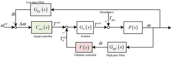 In electromechanical hybrid transmission systems, the introduction of a torsional vibration control loop results in the motor output torque comprising both drive control and torsional vibration suppression components. During actual operation, however, the interaction between vehicle drive control and active torsional vibration control deteriorates system stability and weakens robustness [36]. To address this issue, this study proposes a feedback-filter-based decoupling method for dual-loop motor control in electromechanical hybrid transmission systems, as illustrated in Figure 11. The core idea involves integrating a filter into the feedback loop to achieve frequency-domain decoupling between the drive control (primary-loop) and torsional vibration control (secondary-loop).
