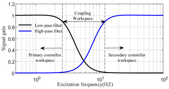 Figure 11 illustrates that the primary-loop drive controller exhibits low-frequency characteristics, responding only to the operational signal, while the secondary-loop torsional vibration controller demonstrates high-frequency characteristics, acting solely on high-frequency torsional vibration signals. Under closed-loop dynamic operation, the main and secondary-loop controllers exhibit coupling behavior, which can be decoupled in the frequency domain under specific conditions to achieve independent control. For clarity, this study distinguishes the feedback signals of the primary and secondary control loops: the filtered feedback signal for system drive control is defined as the operational signal, representing non-periodic speed and torque signals determined by the vehicle’s driving demands under steady-state conditions; the filtered feedback signal for torsional vibration control is defined as the output torsional vibration signal, comprising zero-mean periodic disturbances such as speed and torque fluctuations. To extract these signals, low-pass and high-pass filters are employed in this work.