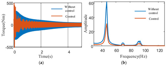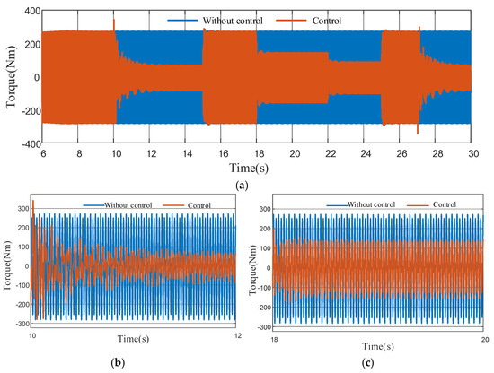 Figure 19 illustrates the variation in output shaft torque fluctuations during the control process. The results demonstrate a significant reduction in torque vibration amplitude following the application of adaptive torsional vibration control. Furthermore, the simulation results reveal a positive correlation between (1) the control intensity, (2) the output shaft torque vibration attenuation amplitude, and (3) the actual active torsional vibration suppression torque generated by the motor.