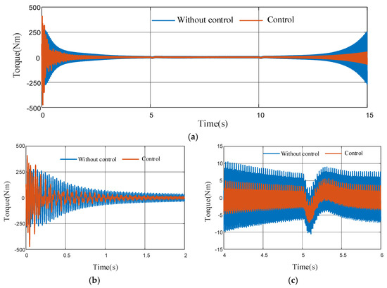 Figure 21 compares the driveline output shaft’s torsional vibration characteristics before and after implementing active suppression control. The results reveal three distinct behavioral phases: (1) During transient engine operations (0–5 s acceleration; 10–15 s deceleration), significant vibration amplitudes occur, while steady-state operation (5–10 s) exhibits reduced vibration levels, with active control demonstrating substantial attenuation throughout all phases (Figure 21a). (2) Initial control implementation (0–2 s) shows heightened vibration due to transient conditions, where the adaptive algorithm’s finite convergence time causes a brief amplitude increase before achieving effective suppression (Figure 21b). (3) During speed stabilization (4–6 s), vibration amplitudes decrease compared to the uncontrolled case, though a torque discontinuity emerges at 5 s when engine acceleration ceases, as visible in the local magnification (Figure 21c). The control system’s transitional response to this operational change confirms its dynamic compensation capability.