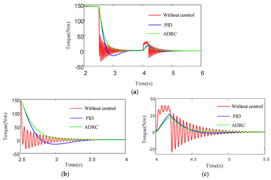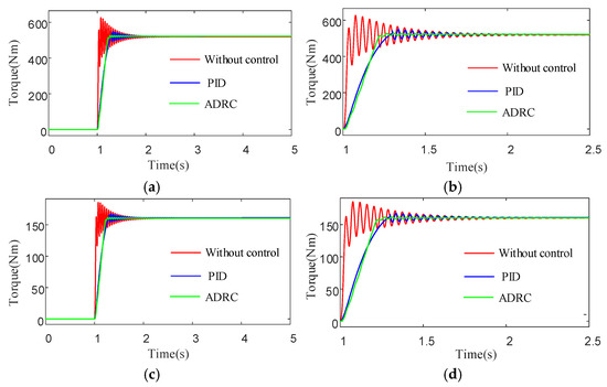 As evidenced by the magnified views in Figure 22b,d, the ADRC strategy demonstrates superior torsional vibration suppression performance. The output shaft torque reaches steady-state within 0.7 s under ADRC control, representing a 70% reduction in stabilization time compared to the uncontrolled case. Furthermore, comparative analysis reveals that the ADRC approach achieves more effective vibration attenuation than conventional PID control during the startup process.