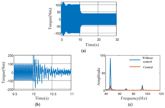 Output shaft torque (1400 rpm). (a) Time-domain characteristics of output shaft torque (0–30 s), (b) time-domain characteristics of output shaft torque (9.5 s–11 s), (c) frequency-domain characteristics of output shaft torque.