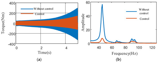 Figure 19b demonstrates that applying active torsional vibration suppression torque to the driveline system achieves a 72.2% reduction in output shaft torque amplitude, decreasing from 270 Nm to 75 Nm when maximum control intensity is implemented.