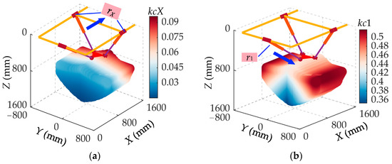 Figure 8 shows that the inertia coupling strength of each branched chain of the P(2PRPU)/PRPS PM changes with the motion attitude of the moving platform, the blue arrows indicate the movement directions of the corresponding side chains. The coupling intensity indices of branched chains kcX, kcY, and kc1 are symmetrical about the Y = 0 plane, consistent with the mechanism’s structural characteristics, while limbs kc2 and kc3 exhibit identical variation trends in opposite directions.