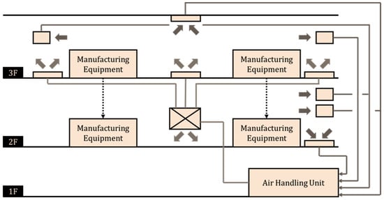 Figure 1, the blank squares likely represent different zones or measurement points on each floor of the factory, while the cross within a square most probably depicts a central air handling component such as an Air Handling Unit (AHU). The lines illustrate the ductwork, with the blue lines and arrows indicating the path of supply air from the central unit to the floors, and the red lines and arrows showing the return air flowing back, while the dotted lines connect the manufacturing equipment to the floors to show the areas influenced by the HVAC system.
