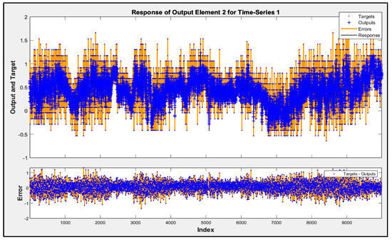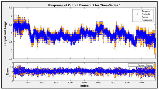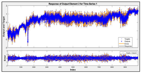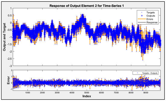 Figure 8. These figures display the actual performance of Model D, which incorporates airflow velocity data, on four separate test datasets (subsets 2–5). In the upper plot of each figure, the blue dots represent the real, measured indoor air pressure differences (the “Targets”). The orange line shows the values predicted by Model D (the “Outputs”). Observing how closely the orange line follows the pattern of the blue dots across the entire time series in each figure directly illustrates the model’s predictive accuracy on that specific subset of unseen data. A tight alignment between the orange line and the blue dots, as is generally visible in these figures, indicates that the model’s predictions closely match the actual measured values. The lower plot in each figure shows the “Error”, which is the difference between the actual target and the predicted output. The distribution of these error points around the zero line indicates the magnitude and variability of the prediction errors. The fact that most error points are relatively close to the zero line across all four subsets visually supports the quantitative R