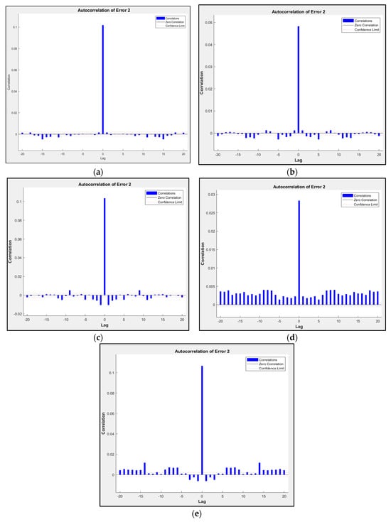 Figure 9a–e. The plots’ horizontal axes depict lag values, signifying the time interval by which the error terms are compared. For instance, lag 1 compares consecutive error terms, lag 2 assesses error terms separated by two time points, and so forth. On the other hand, the vertical axis on the plot displays autocorrelation coefficients, quantifying the magnitude and direction of correlation among error terms at the chosen lag. For a perfect prediction model, there should only be one non-zero value of the autocorrelation function that occurs at zero lag. This occurrence signifies that the prediction errors are entirely uncorrelated, resembling white noise.