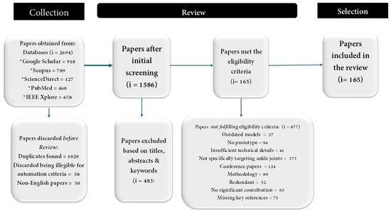 As explained in Figure 1, In the initial phase of searching, 2694 papers were found in relevance to the topics being discussed. After the final phase of screening, 175 papers were shortlisted. As the review focuses on journal papers only, conference proceedings and book chapters related to the topic have not been included. The publications reviewed in this article are screened on the basis of the quality of data being presented. Papers containing substantial information about the mechanical design, actuation, control strategies, and performance of the ankle joint rehabilitation robots have been preferred.