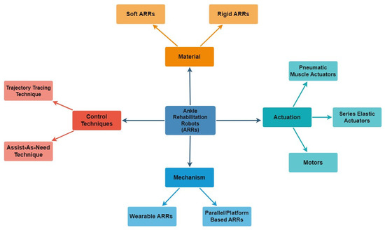 Over the past two decades, numerous studies have reviewed ankle rehabilitation robots depending on their type, mechanical design, and performance. Researchers have shown great interest in evaluating different control strategies and actuation methods that have been developed to enhance the efficiency and accuracy of ankle rehabilitation robots [6,9,25]. This study aims to review the types of ankle rehabilitation robots designed in recent years based on their mechanical design and actuation techniques. Specifically, it addresses the following research questions: