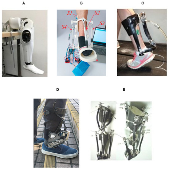 Different WRRs reported in the literature. (A) Ankle–foot simulator [34]; (B) ankle exoskeleton [35]; (C) neuromechanics-based powered ankle exoskeleton [36]; (D) robot-assisted AFO [37]; (E) knee–ankle–foot orthosis (KAFO) [38].