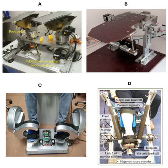 Different PARRs reported in the literature. (A) Ankle rehabilitation platform [39]; (B) ankle robot [40]; (C) novel ankle rehabilitation robot (NARR) [41]; (D) ankle robot [42].
