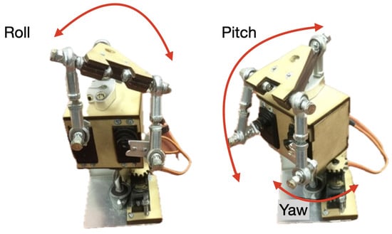 Figure 1. A third MG946R servomotor, with an equal torque of 13 kg·cm, allows the platform to rotate on its vertical axis, achieving a yaw motion (approximate range of 180°). All servomotors are driven by Pulse Width Modulation (PWM) signals generated by an Arduino Nano microcontroller from Arduino Company (Monza, Italy) ensuring precision and real-time response.
