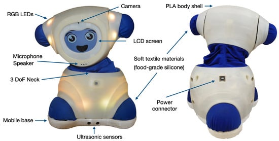 15]. Its external appearance includes soft and textured materials that encourage tactile interaction. The robot also includes customizable clothing made from different fabrics and colors, offering additional sensory stimulation and personalization options during therapy or educational sessions.