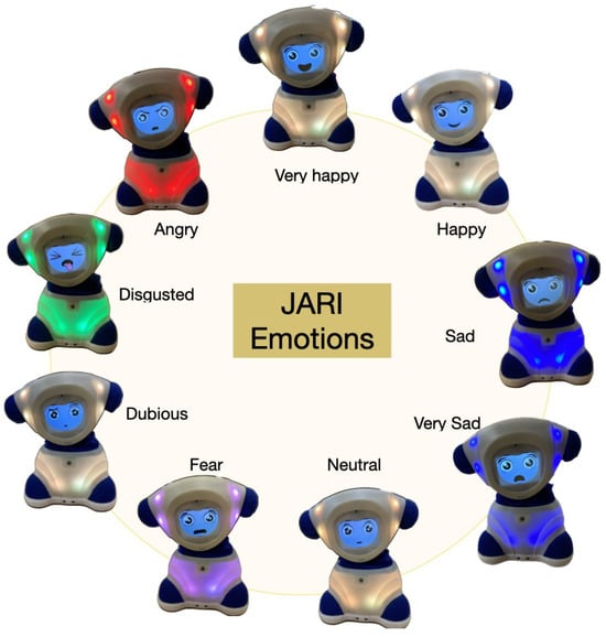 Emotion display: JARI must be capable of expressing a range of predefined emotions to promote emotional recognition and interaction. The current set includes the following nine emotions: happy, very happy, sad, very sad, disgusted, angry, fear, dubious, and neutral.