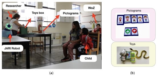 Interaction setting for Scenario 1. (a) Classroom configuration showing the JARI robot positioned on a desk, with the researcher nearby and the Wizard of Oz operator seated at the back of the room. The child interacts with the robot using toys and pictograms provided during the session. (b) Pictograms and toy objects used to facilitate communication and elicit emotional responses from the robot.
