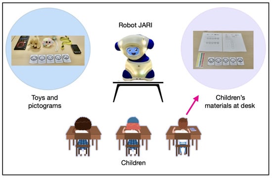 Interaction setting for Scenario 2. At center, children were seated at individual desks facing the JARI robot, which responded with emotional expressions to the objects presented. At both sides, details of the materials used: Toys and ARASAAC pictograms for the interaction, and response sheets with colored stickers for the post-interaction questionnaire.