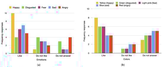 Children’s preferences in Scenario 1. (a) Preferred emotional expressions displayed by the robot. (b) Preferred colors associated with the robot’s emotional expressions.