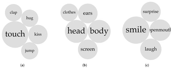 Types of behavioral interactions: (a) Physical gesture actions. (b) Robot’s areas touched by children. (c) Facial expression actions.