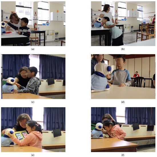 Pictures of actions performed by children interacting with the JARI robot: (a) Child touching the robot’s head. (b) Child approaching and looking closely at the robot’s screen. (c) Child putting a carrot on the robot’s screen. (d) Child smiling while interacting with the robot after presenting an object. (e) Child touching the robot’s ears. (f) Child looking at the robot screen very closely and touching her head with the robot’s head.