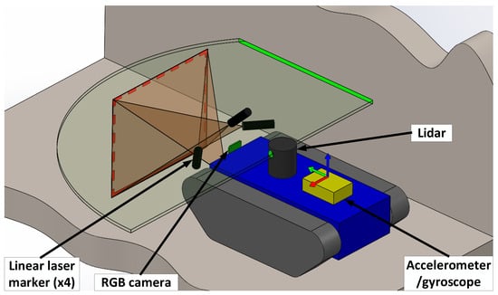 The red lines represent the possible detection field of view marked by linear laser pointers. To further extend the robot’s field of view, 2D LiDAR is added to better recognize the sides of the robot, which comes in handy in close gaps. In addition to object recognition, odometry data are also important for local navigation systems. Some of the sensors most frequently used for this purpose are accelerometers and gyroscopes. An accelerometer is very useful for measuring tilt, which is important in challenging terrain scenarios, while a gyroscope helps to check the robot’s rotation [21,27,28]. Both of these sensors are integrated into the designed robot system for better orientation. Magnetometers are also very useful for estimating heading, which is commonly combined with accelerometers and gyroscopes, but due to their dependency on the magnetic field, it is not reliable for underground sewer conditions [29].