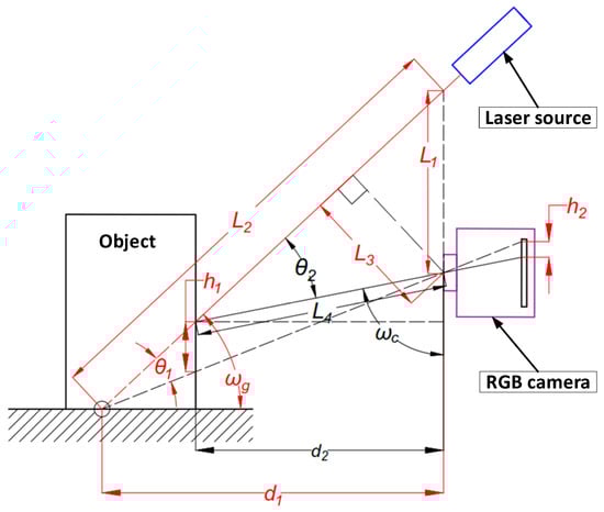 As previously mentioned, a combination of an RGB camera and a laser pointer has been researched in the literature as a practical obstacle detection, distance, and geometry measurement solution. The main idea behind this method is laser triangulation, as shown in Figure 2.