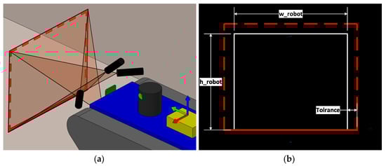 Adding another laser marker pointing from the left side allows us to detect the obstacles fixed to the right wall, as shown in Figure 3b. Moreover, adding laser markers from the bottom and right sides allows for the detection of obstacles fixed to all surfaces, creating a field of view whose size depends on the system configuration, linking each laser marker with the camera, as shown in Figure 2. Thus, the rectangular field of view is created by adding additional tolerance around the dimensions of the robot, as shown in Figure 4b.