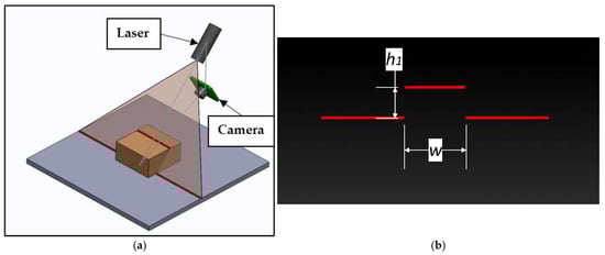 To test the designed scanner, the first experiment will be performed with one laser pointer. The goal of this experiment is to check the accuracy of distance measurement to an obstacle using an RGB camera and a linear laser marker. Accuracy is estimated by comparing the measured value with a laser scanner and the real dimensions. The laser that projects the light to the ground is used as shown in the simplified configuration of the system in Figure 4a.