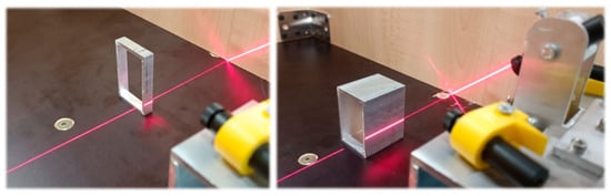 In Figure 5b, a camera view example is shown corresponding to the position of the measurement system in Figure 5a. From an image, not only can displacement—h1—be measured, as explained earlier, but width—w—can also be measured, and the result can be directly converted to the real width of an obstacle. During the experiment, only cuboid forms are used as obstacles for testing the system. To be able to evaluate the accuracy of the designed measurement system, it is important to gather relevant data. For this reason, obstacles of different widths are used, including obstacles that are 5, 10, 30, and 50 mm wide. During the experiment, an obstacle is put in front of the laser scanner in a tunnel-like environment, as shown in Figure 6.