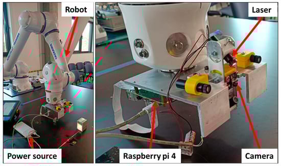 After calibrating and testing the laser marker and the RGB camera-based measurement system, it can be applied to the intended autonomous sewer robot. Calibration of the measurement system with the industrial robot was performed according to the designed mobile robot prototype geometry. Laser makers and cameras could then be assembled directly on the mobile robot platform shown in Figure 23.
