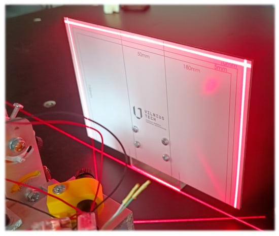 From Figure 8, it can be seen that the calibration plate has linear markings indicating the robot’s dimensions and a tolerance of 10 mm. The camera is positioned straight, while the upper laser pointer, which will be used in the experiment, is tilted at an angle, lining up with the laser projection at the bottom of the calibration plate. According to Figure 2, angle ωg is equal to 40.5°. Other dimensions marked in red can also be estimated by using a 3D modeling program and a 3D model of the system. The following dimensions are determined in advance: