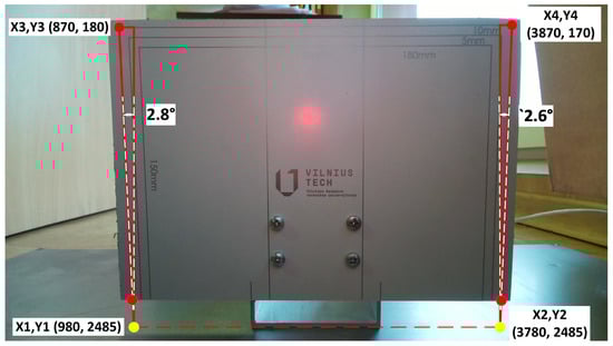 The calibration plate is marked with lines representing the scanning region with specified values—width wr = 200 mm and height hr = 160 mm. To convert pixel size to the real length, firstly, the corners of the calibration plate are marked in the captured image as shown in Figure 8. Red corners represent the corners of the plate, and yellow corners are projections of the bottom corners of the scanning region, which are estimated geometrically via solidworks 2024 (Student’s version) modeling software. To find pixel real dimensions as width wpxi and height hpix, the following proportions are used, as defined in Equations (5) and (6):