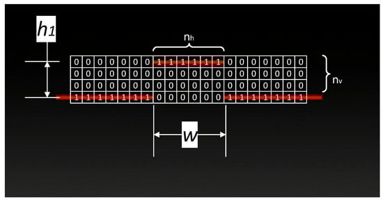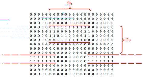 The described procedure allows for a reduction in memory load. Segmentation value will be defined as k (nh2, nv2), where nh2 represents how many pixels are stored horizontally in the analyzed squared region, and nv2 represents the number of pixels stored vertically. Looking at Figure 11, it can be seen that depending on the segmentation value, the detected laser line can be divided into several pixels. For this reason, the calculation of pixels horizontally and vertically is performed as shown in Figure 15.