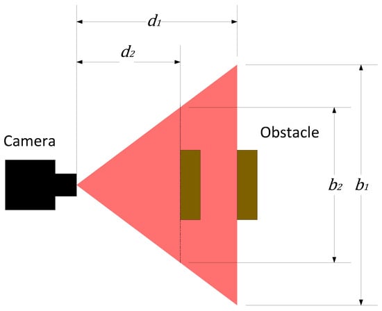 where nv is the number of pixels shown vertically. Nevertheless, as seen in Figure 9, the vertical view is stretched, and the width at the bottom of the calibration plate and the top is different. This happens because the camera used has a very wide field of view, which results in a slightly distorted view on the sides. Because of this, width has to be compensated depending on the distance from the obstacle, which is determined by displacement h1. Another factor that significantly affects width calculation is the camera perspective angle from different distances, which is visually presented in Figure 11.