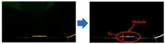 Pixels marked with 1 represent the detected color of the laser, while 0 s represent the filtered zone of a different color. The obstacle height can be calculated by the following formula: