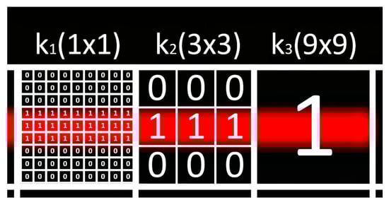 Filtered pixels are changed to a white color with a value of 255, and background pixels are changed to black with a value of 0. This simplifies the calculations used to find regions of interest. Another factor that greatly affects image recognition accuracy and processing speed is segmentation. Reading the value of every pixel and saving it in the memory is computationally demanding. It is more convenient to separate the image into larger square segments, as shown in Figure 14.