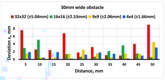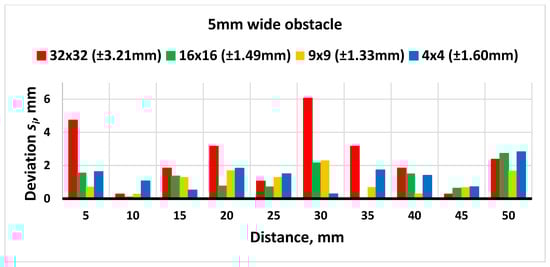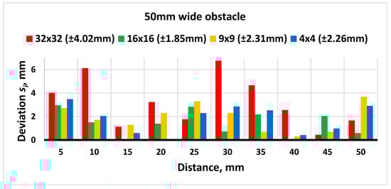 Looking into the results acquired from measuring a 50 mm wide obstacle, it is noticeable that the highest deviation remains when the segmentation value is 32 × 32. Nevertheless, the lowest resolution is reached with a segmentation value of 16 × 16, and this is increased by further lowering the segmentation to 9 × 9 and 4 × 4.