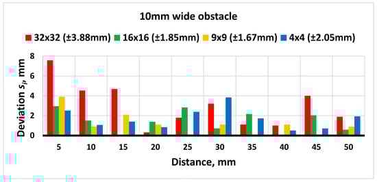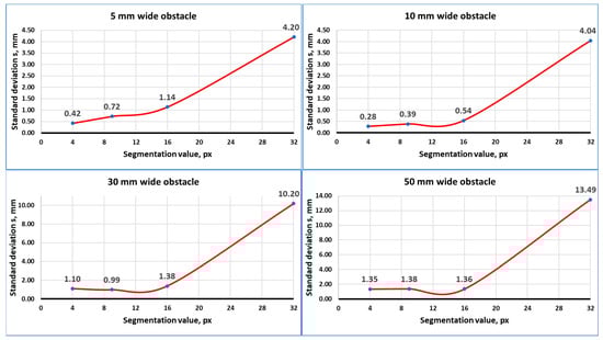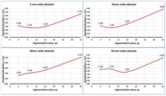 Looking at the figure above, it can be noticed that the standard deviation has a similar tendency when measuring a 10 mm wide obstacle. It is highest at a segmentation value of 32 × 32. Then, increasing the number of pixels processed, the lowest deviation is reached with a 9 × 9 value. Decreasing the value further increases the deviation.
