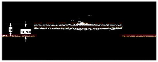 It is noticeable that the laser line projected on the obstacle is thicker than the line projected on the ground due to geometrical conditions. Because of this measured displacement, h1 is between the estimated lines by the algorithm, which is larger than the displacement between the line projected on the ground and the nominal real line corresponding to h_real shown in the figure above. Moreover, additional peaks of reflected light also increase h1 and influence measurement deviation. To compensate for the reflection influence coefficient—a is adjusted, which is expressed in Formula (2):