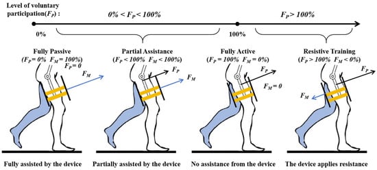 In contrast to adult exoskeletons, which are often categorized into fully or partially assistive modes [], rehabilitation in children with CP is a dynamic process. As recovery progresses, the level of active participation gradually increases. A binary classification of “active” versus “passive” control is insufficient to describe this gradual transition []. As illustrated in Figure 1, the level of machine assistance should adjust in response to the patient’s active participation , ranging from 0% to 100%. In early stages, children may rely entirely on passive support; as function improves, partial voluntary control should be encouraged, eventually progressing to active training or even resistance training. Therefore, CPLLE control strategies should dynamically adjust assistance intensity to cover a continuous segment of the rehabilitation spectrum, aiming to maximize voluntary motor engagement and promote gradual neuromotor recovery.