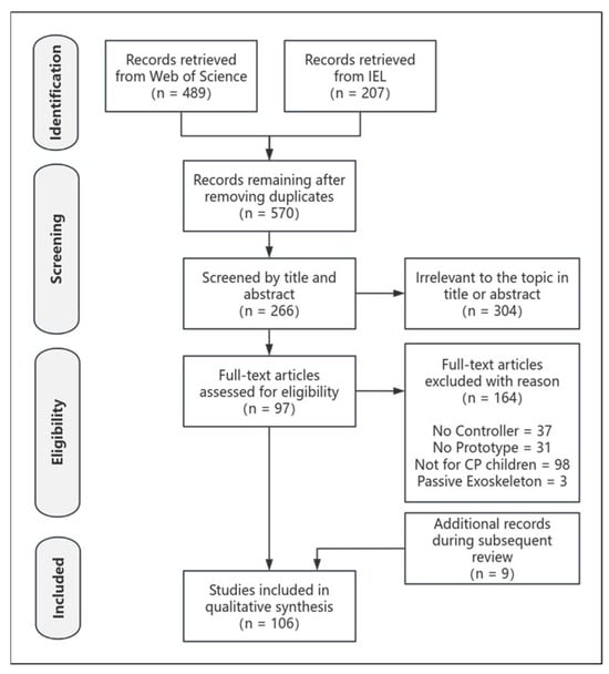 Using these search terms, a total of 696 relevant publications (up to January 2025) were retrieved as follows: 489 from Web of Science and 207 from IEL, with 126 duplicates between the two databases. After reviewing titles and abstracts, 304 publications unrelated to the review topic were excluded. A full-text examination of the remaining publications led to further exclusions: 98 studies did not target CP children, 37 did not mention control strategies in exoskeleton design, 31 focused on control strategies still in the simulation stage without physical prototypes, and 3 investigated passive exoskeletons that relied solely on mechanical mechanisms rather than active control, which were beyond the scope of this study. Ultimately, 97 publications met the inclusion criteria. During the subsequent review process, nine additional relevant studies were identified, bringing the total number of fully reviewed articles to 106. The literature selection process followed the PRISMA flowchart, as illustrated in Figure 2.