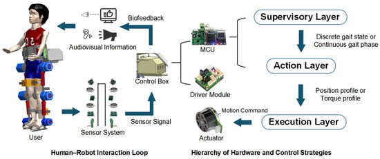 - Delgado-Oleas, G.; Romero-Sorozabal, P.; Lora-Millan, J.; Gutierrez, A.; Rocon, E. Bioinspired Hierarchical Electronic Architecture for Robotic Locomotion Assistance: Application in Exoskeletons. IEEE Access 2023, 11, 131610–131622. [Google Scholar] [CrossRef]