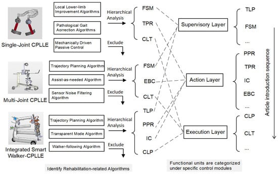 As illustrated in Figure 4, this study focuses exclusively on the control processes directly related to rehabilitation training in different types of CPLLEs. To ensure terminological consistency, a complete CPLLE control system is uniformly referred to in this study as a “controller” or “control strategy”. It is further decomposed into multiple “functional units” based on their respective roles. Functional units identified in the reviewed literature are structurally analyzed and hierarchically organized into corresponding “control modules”. Ultimately, these control modules serve as the fundamental analytical units of this review, supporting a hierarchical examination of CPLLE control systems. This structured approach not only clarifies the commonalities and differences among diverse studies but also highlights the varying implementations of similar control strategies across different device types.
