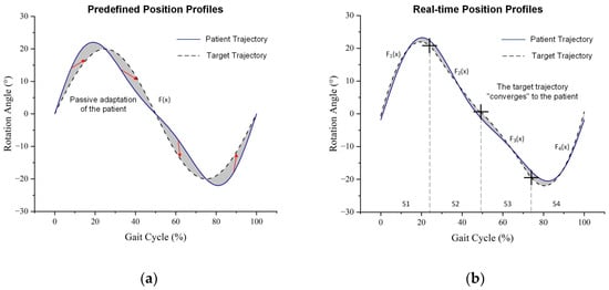 A predefined position profile is one of the simplest and most direct trajectory planning methods, commonly utilized in the initial stages of exoskeleton development or in passive mode design. As illustrated in Figure 5a, this method involves the device strictly following a pre-set gait trajectory (dashed line) to adjust the patient’s lower-limb joint angles (solid line). The shaded area in the figure represents the deviation between the target and actual trajectories, where larger areas generally indicate higher levels of passive intervention torque applied by the system to enforce the prescribed motion rhythm. These methods have a low computational cost and provide clear rhythmic patterns, making them practical for early-stage rehabilitation in children with CP who have limited muscle strength and underdeveloped motor control.