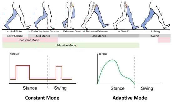 In multi-joint exoskeletons, FSM is often combined with IC to dynamically regulate joint stiffness. Studies such as [,,] utilize FSM to increase impedance during the stance phase to enhance stability while reducing impedance during the swing phase to optimize gait flexibility. In another approach, Gait Guidance Control [,] applies damping forces only during the swing phase to correct abnormal gait deviations. Additionally, research combining FSM with NMES [,,,,,] applies electrical stimulation during the stance phase to enhance muscle strength, improve motor function, and reduce spasticity, thereby optimizing crouch gait correction.