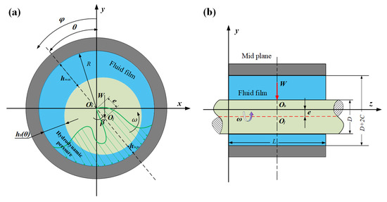 Schematic diagram of the hydrodynamic bearing: (a) front view; (b) side view.